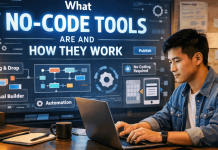 No-code tools give you visual interfaces to build websites or apps without code. You use components, drag-and-drop systems, and pre-built logic blocks.